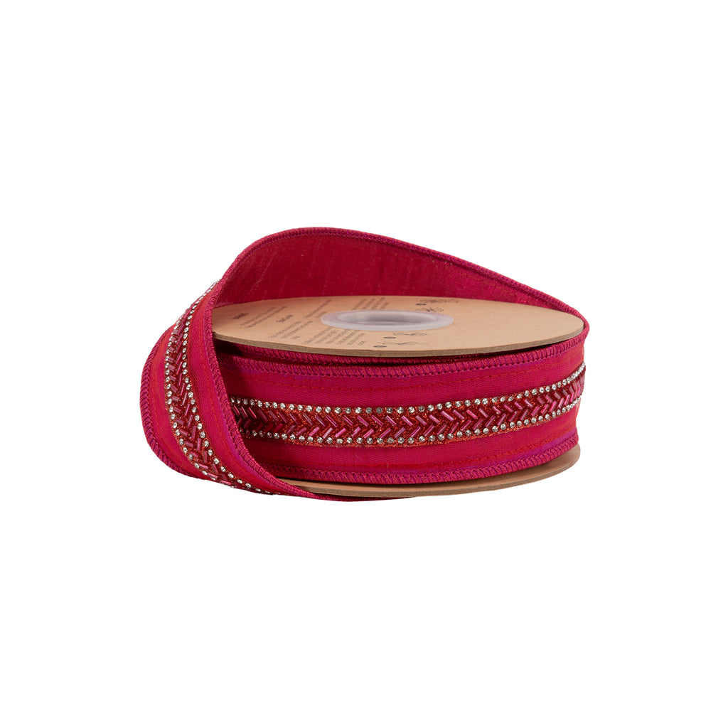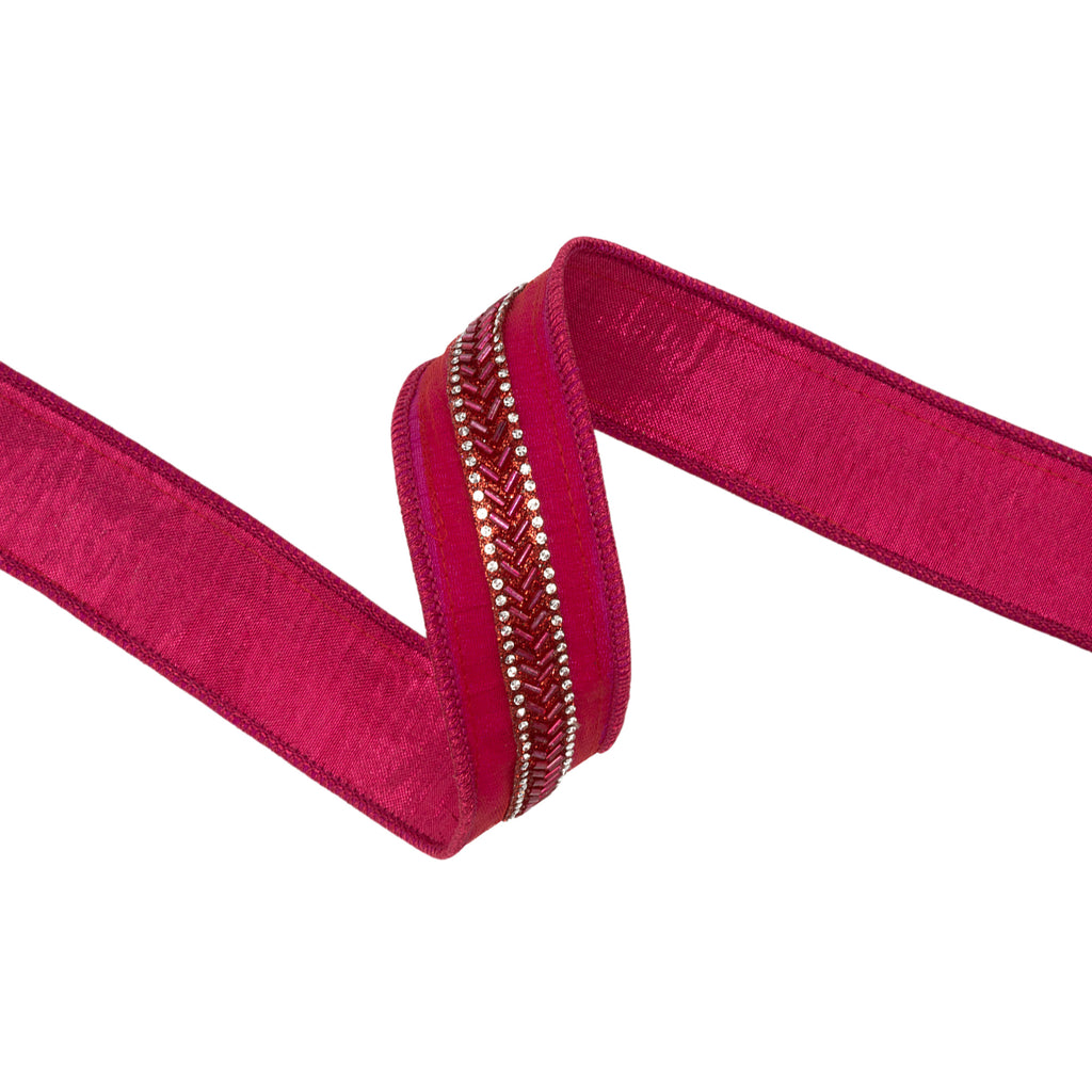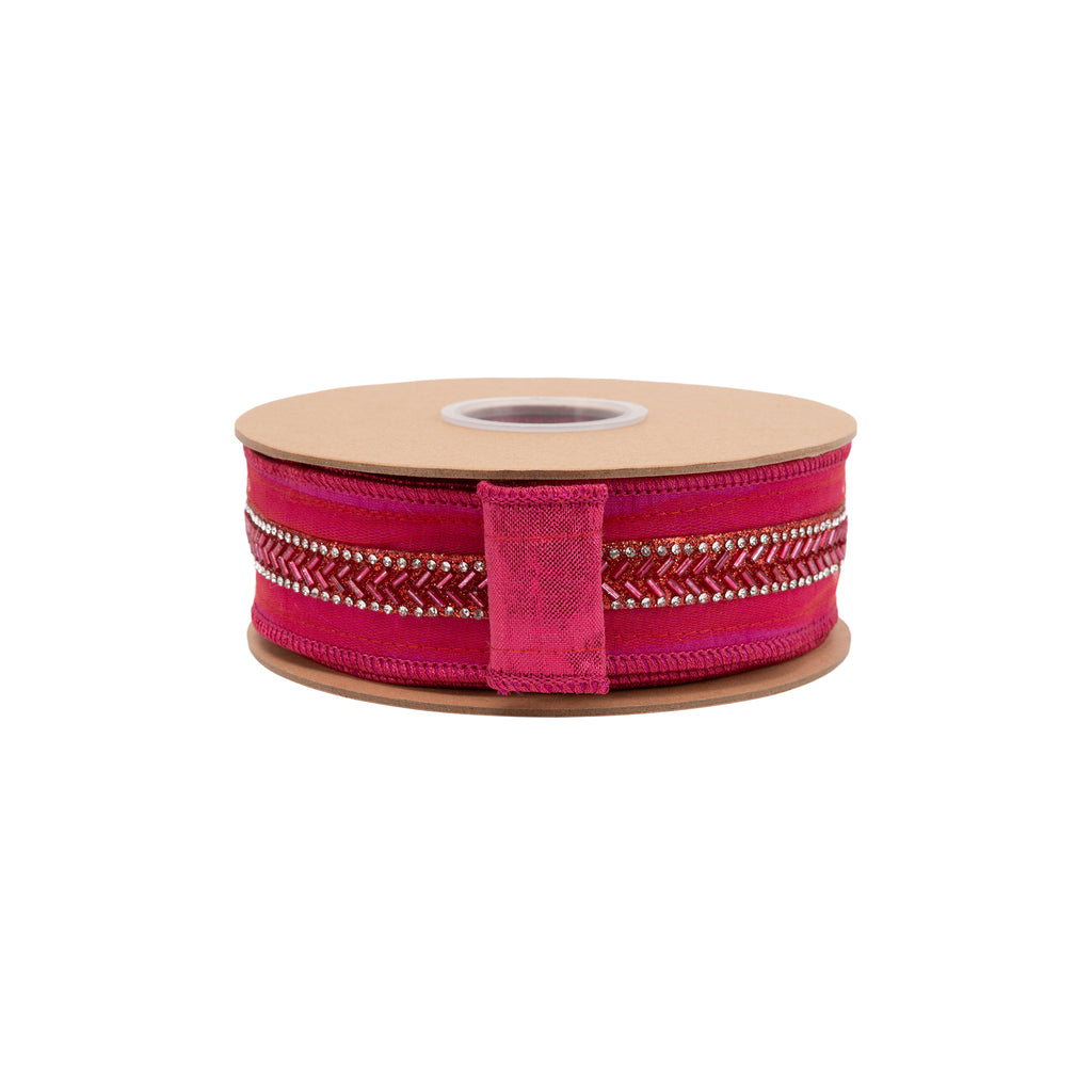 1 1/2" Wired Dupioni Ribbon | Hot Pink w/ Beaded Trim and Pink Metallic Backing | 10 Yard Roll