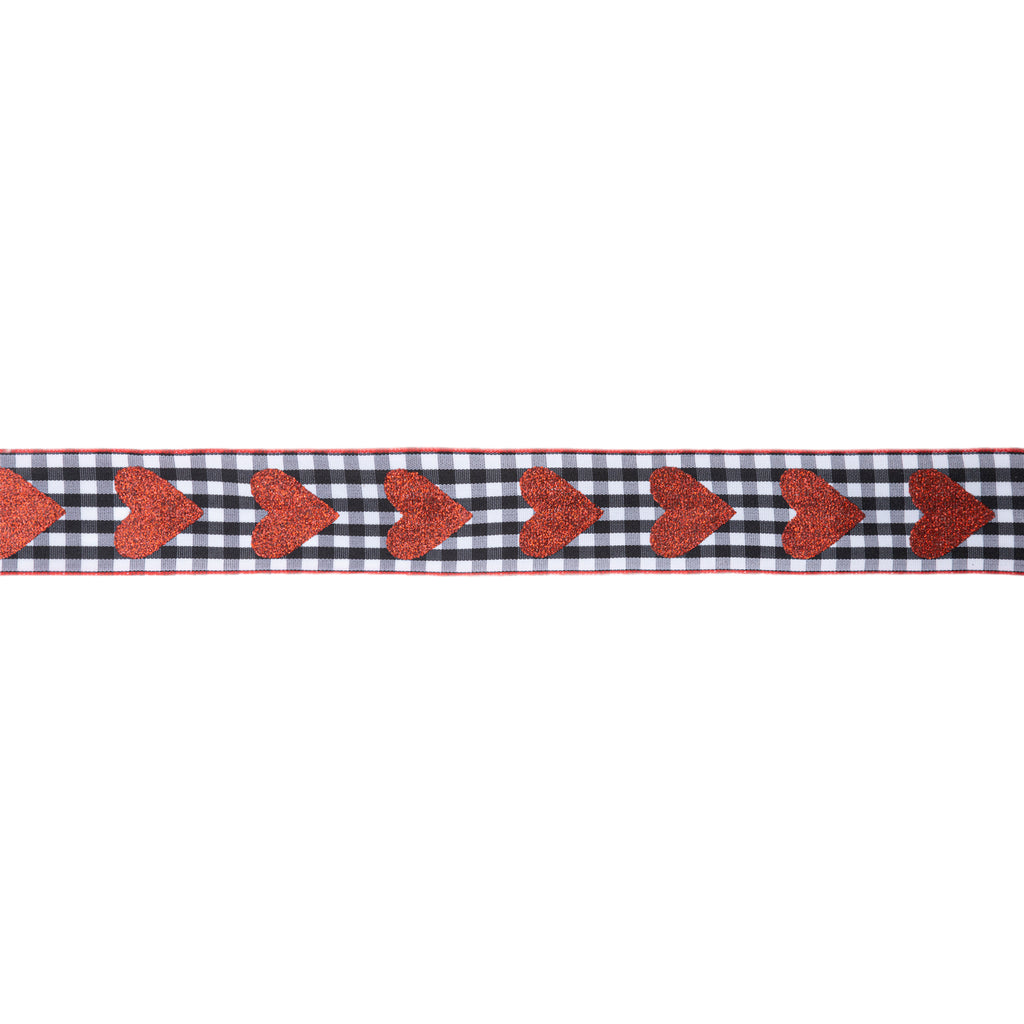 1 1/2" Wired Ribbon | Glitter Heart on Black/White Gingham | 10 Yard Roll