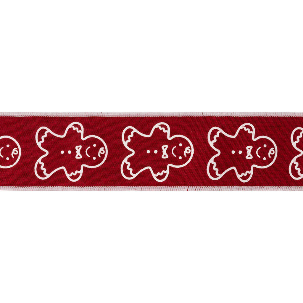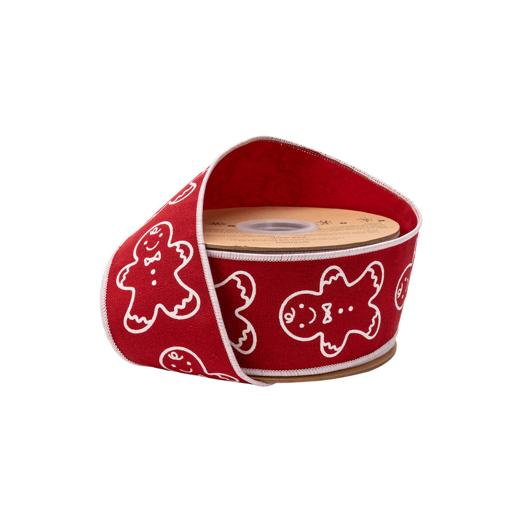 2 1/2" Wired Cotton Linen Fabric Ribbon | Printed Gingerbread on Red | 10 Yard Roll