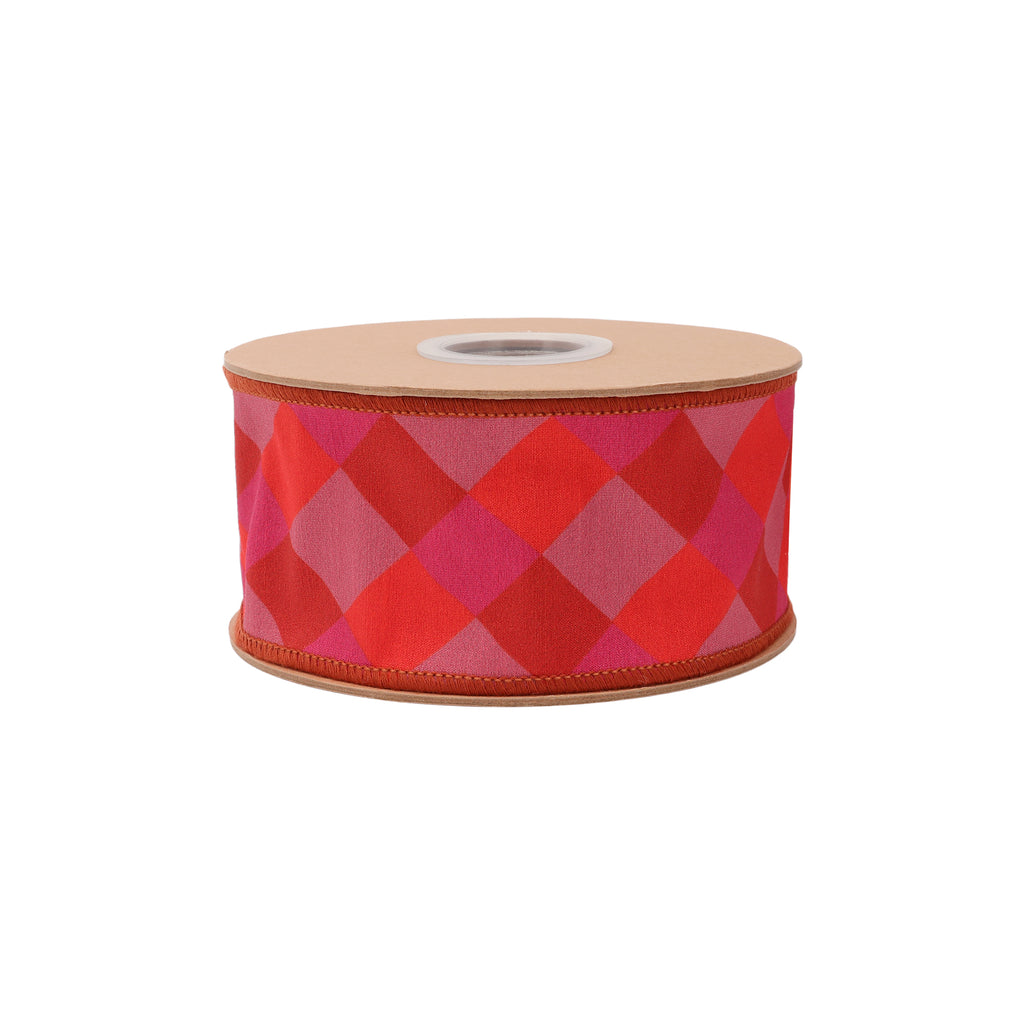 2 1/2" Wired Dupioni Ribbon | Orange/Pink/Red Bias Plaid w/ Red Fused Dupioni Backing | 10 Yard Roll