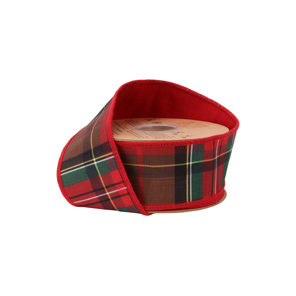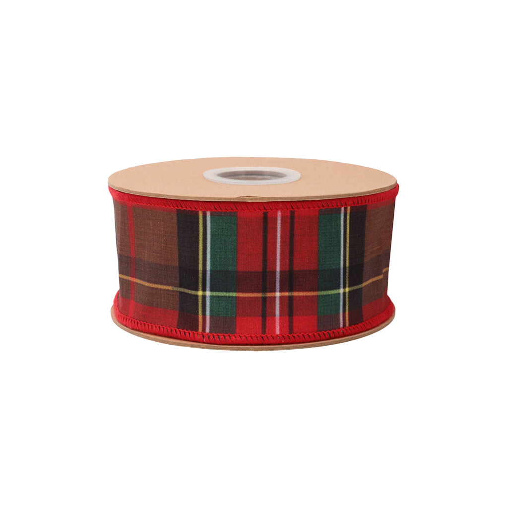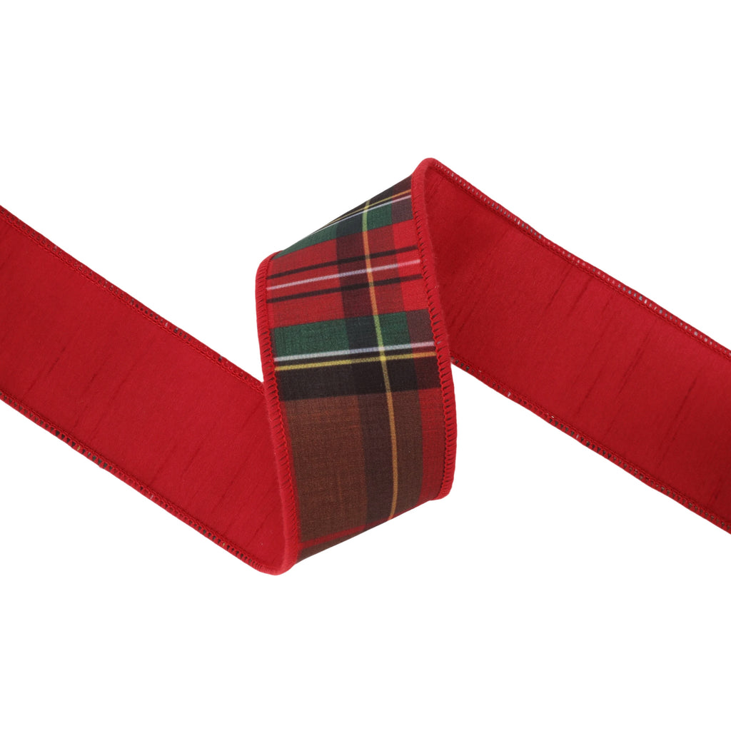 2 1/2" Wired Dupioni Ribbon | Red/Brown Plaid w/ Red Fused Dupioni Backing | 10 Yard Roll