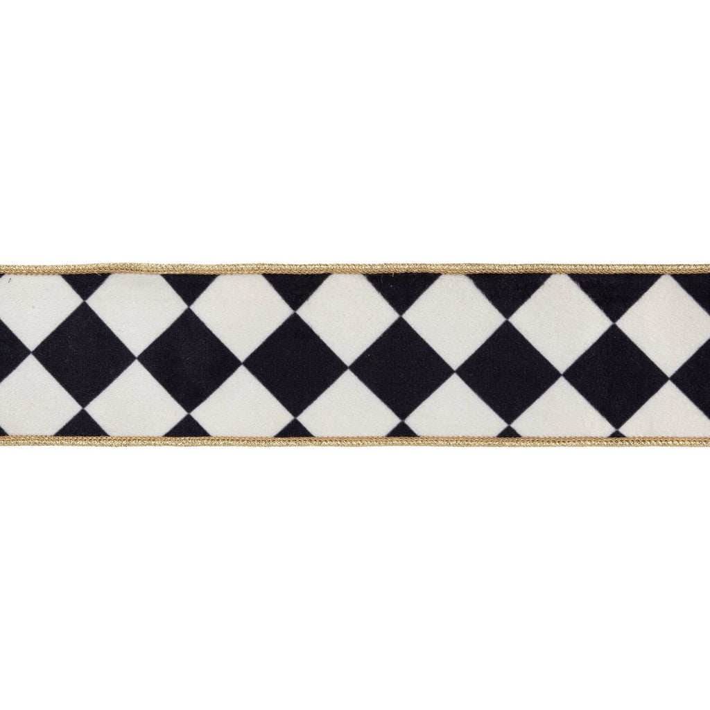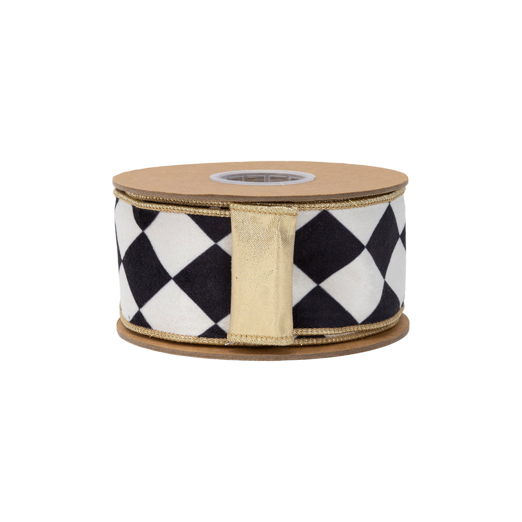 2 1/2" Wired Velvet Ribbon | Black and White Rhombus w/ Metallic Gold Backing | 10 Yard Roll