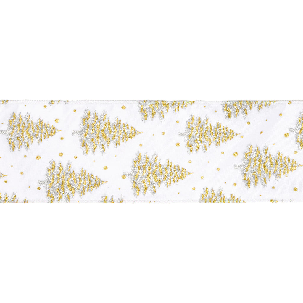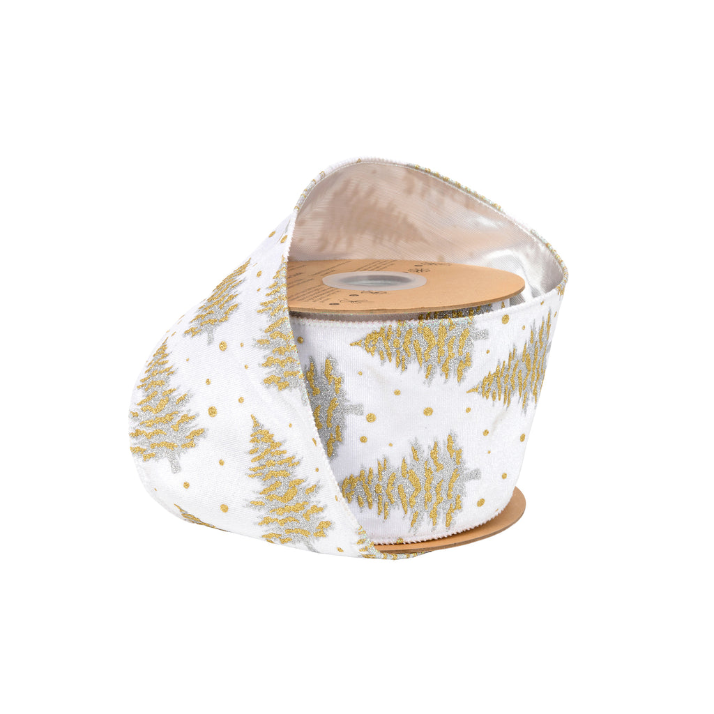 3 3/4” Wired Velvet Ribbon | Gold/Silver Trees on White w/ Silver Backing | 10 Yard Roll
