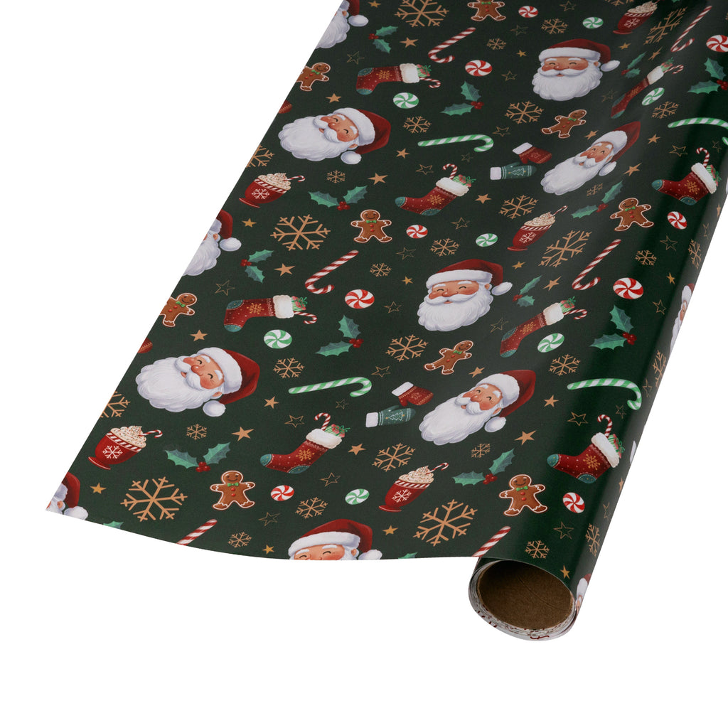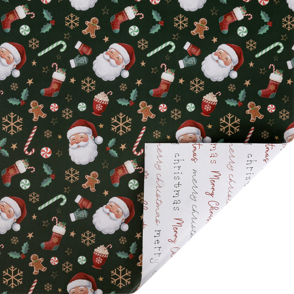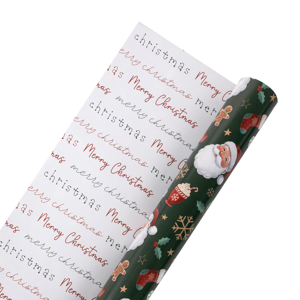 30" x 10' Holiday Reversible Wrapping Paper | Santa w/ Treats and Merry Christmas Script