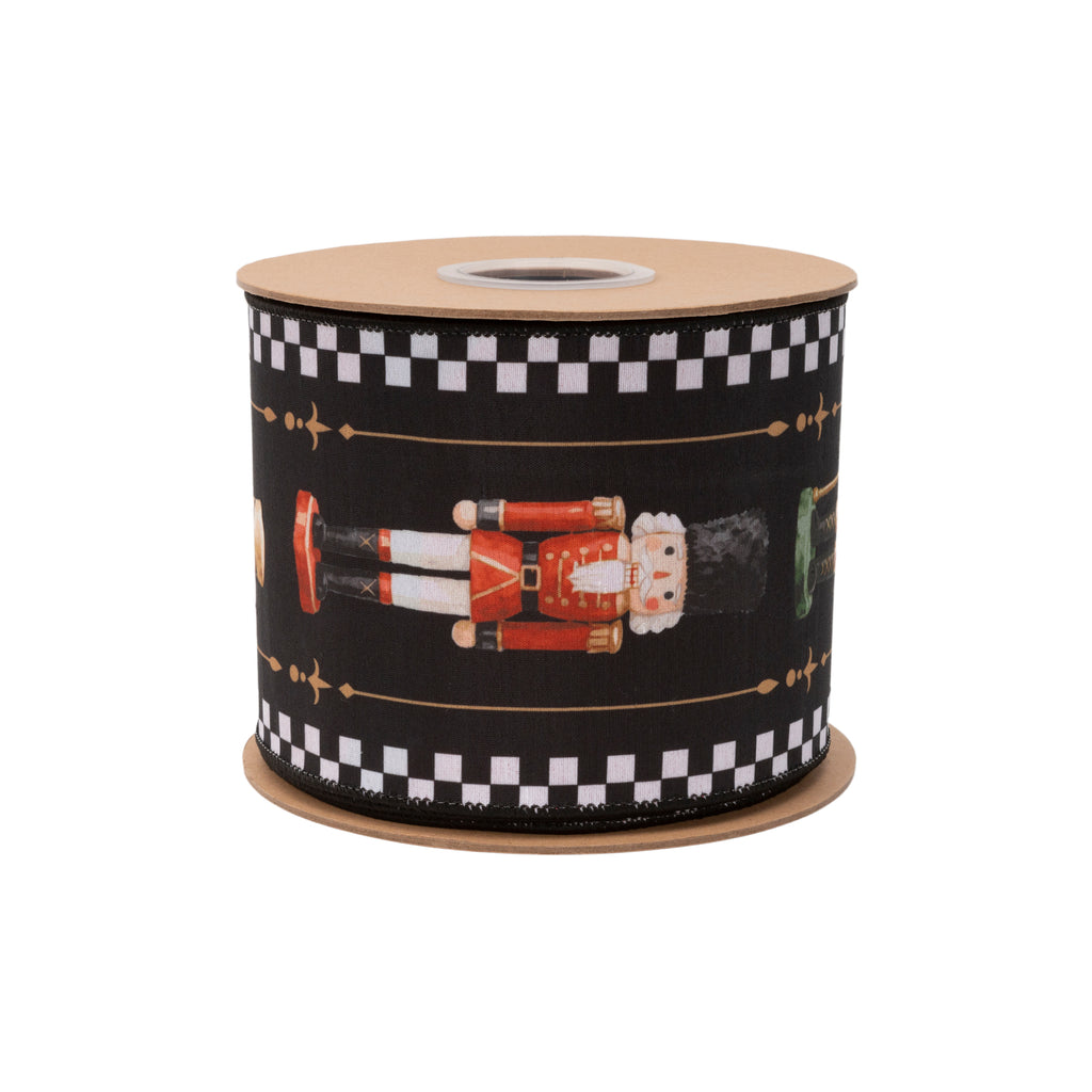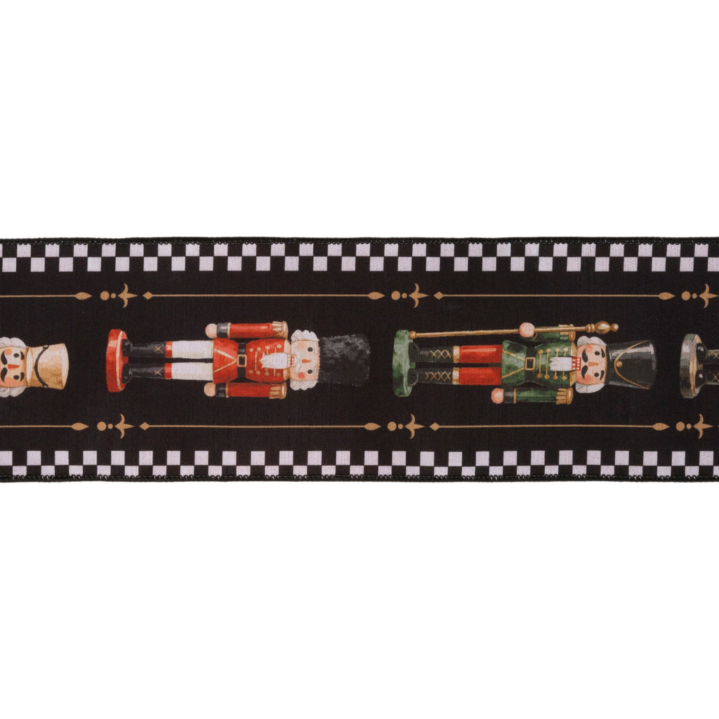 4" Wired Dupioni Ribbon | Black/White Check Nutcracker on Black w/ Red Backing | 10 Yard Roll