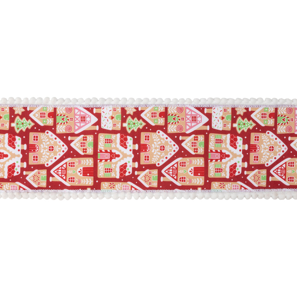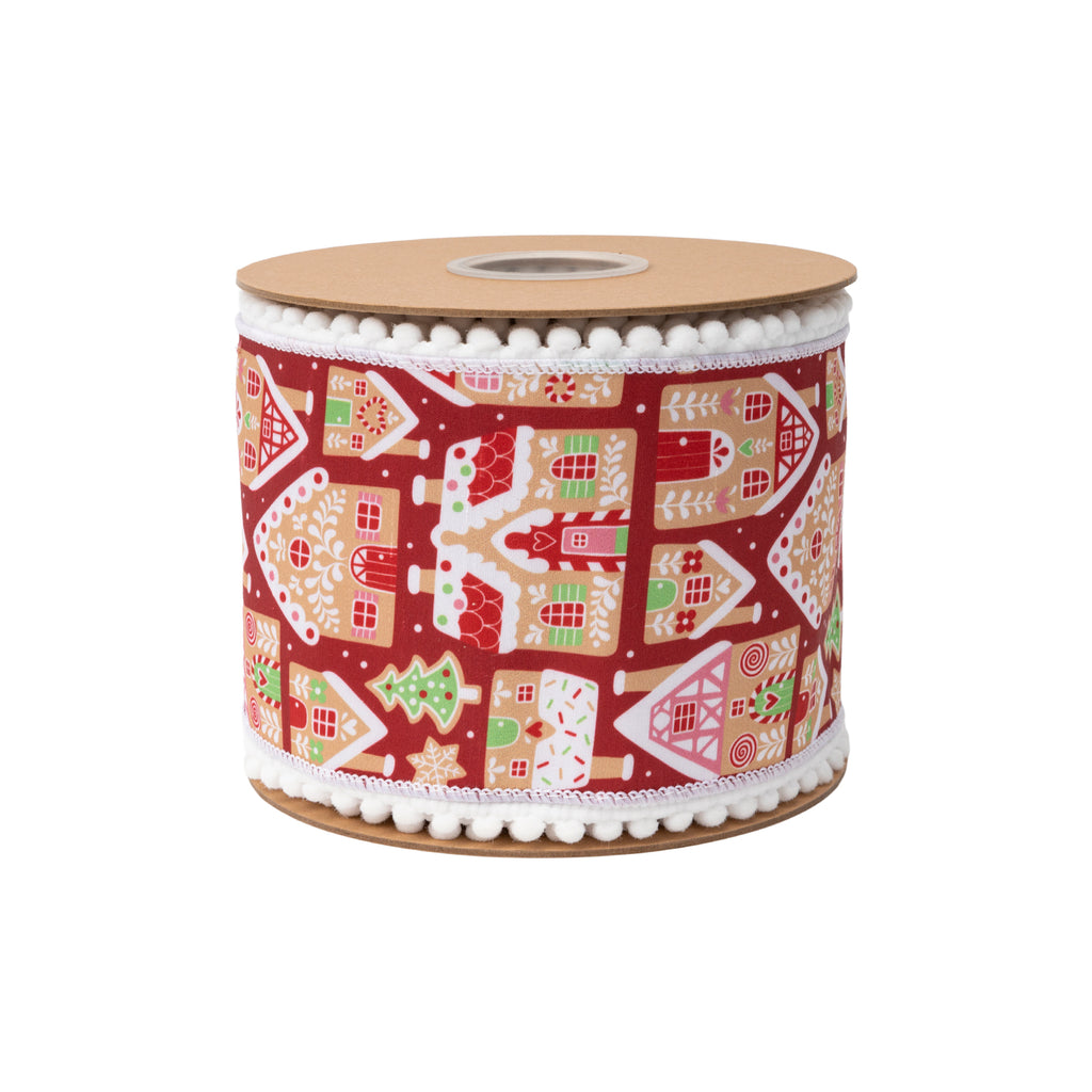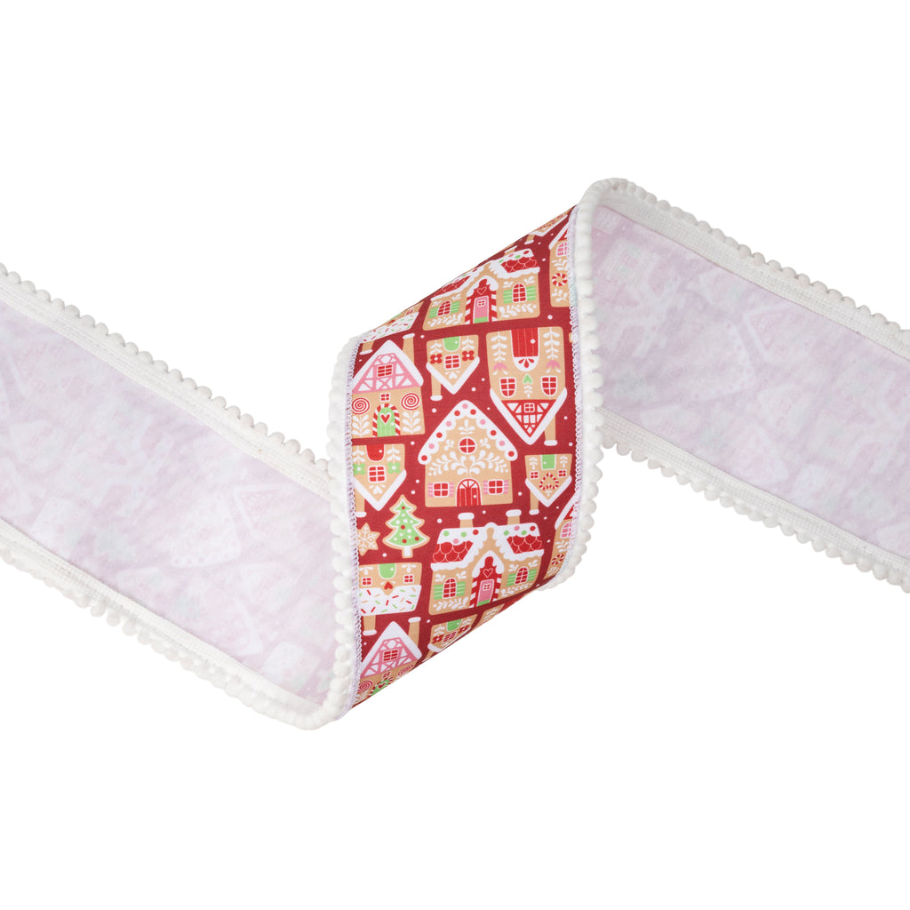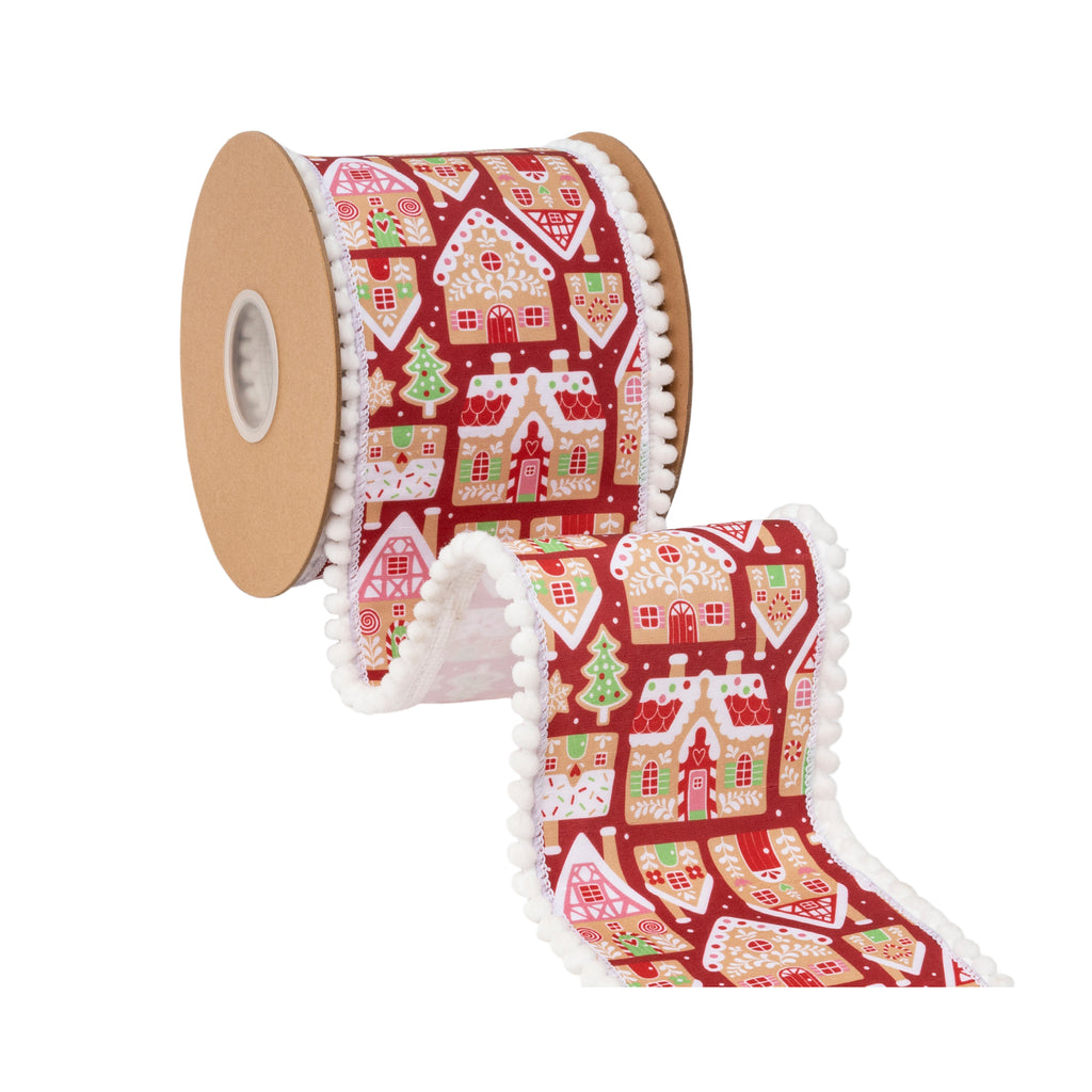 4" Wired Dupioni Ribbon | Gingerbread Houses on Red w/ White Backing | 10 Yard Roll