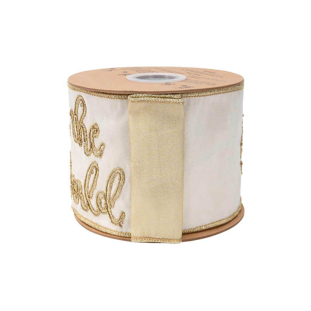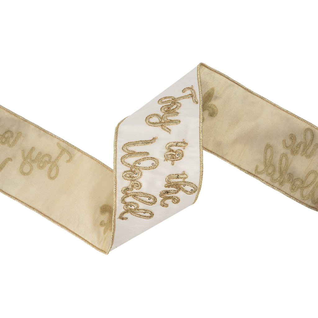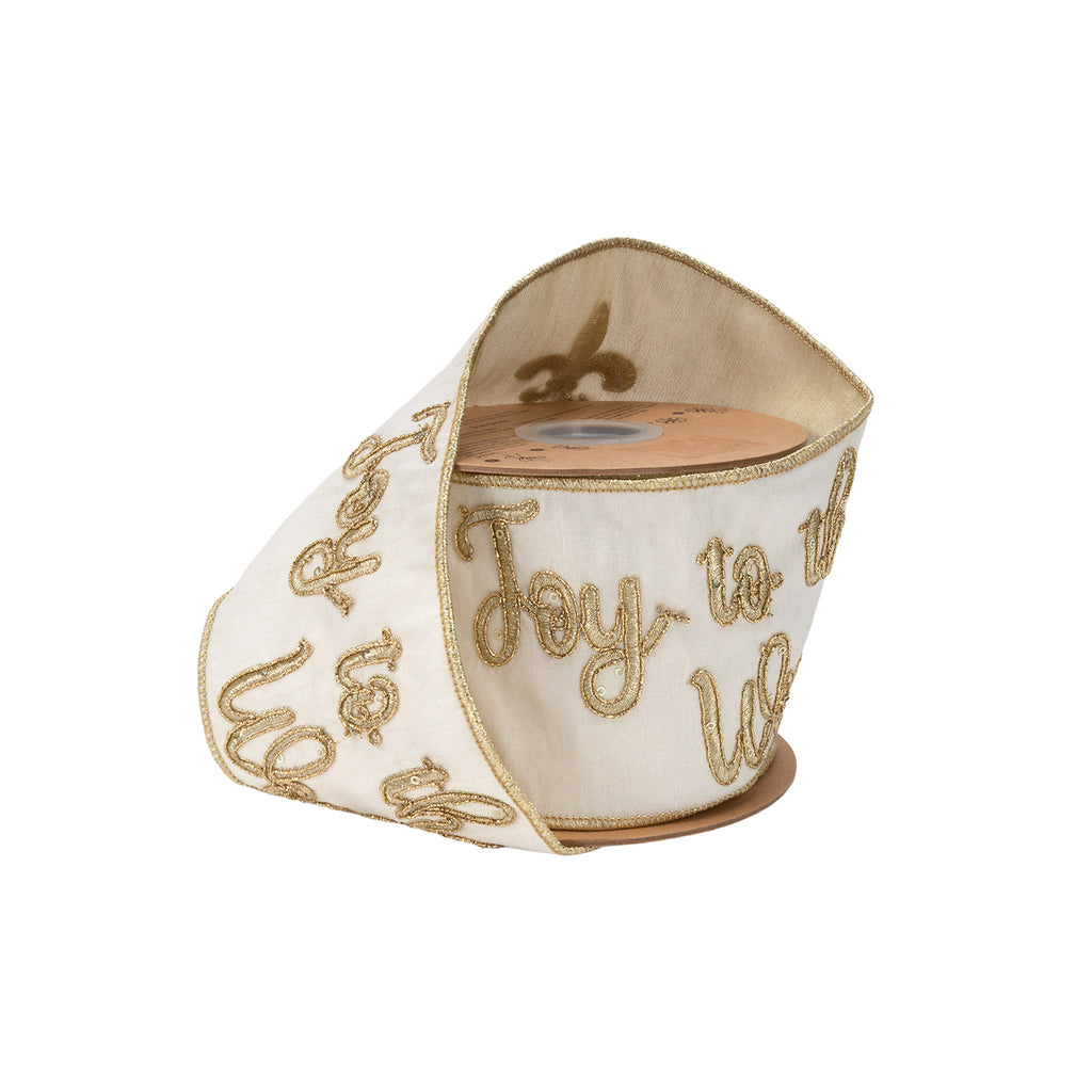 4" Wired Dupioni Ribbon | Gold Embroidered "Joy to the World" on Ivory w/ Gold Tissue Backing | 10 Yard Roll