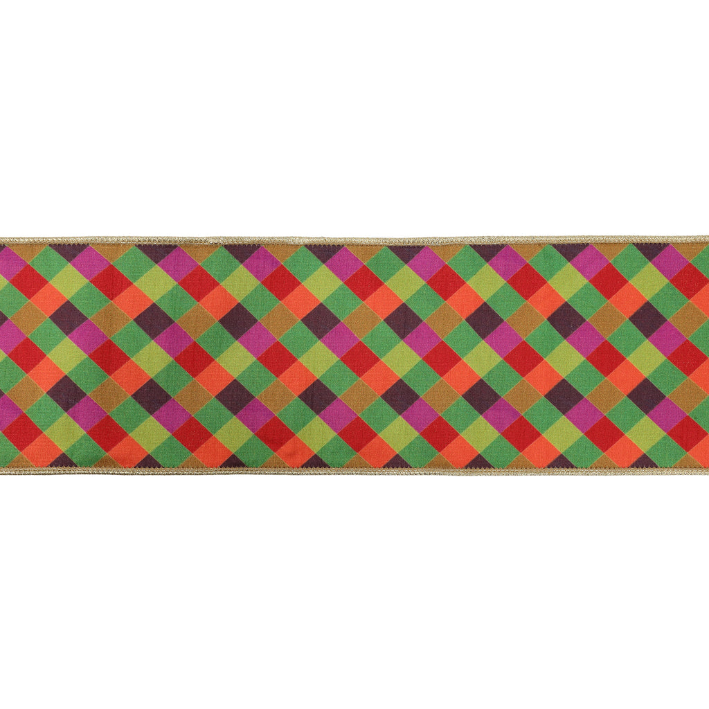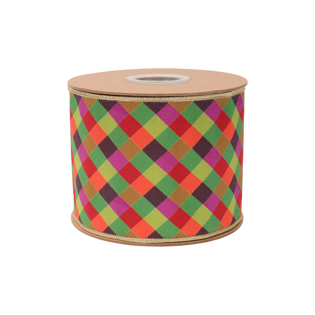 4" Wired Dupioni Ribbon | Multi Jewel Tone Small Bias Check Plaid w/ Gold Metallic Fused Dupioni Backing | 10 Yard Roll