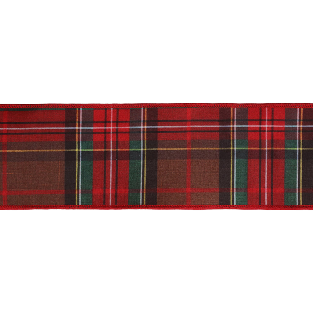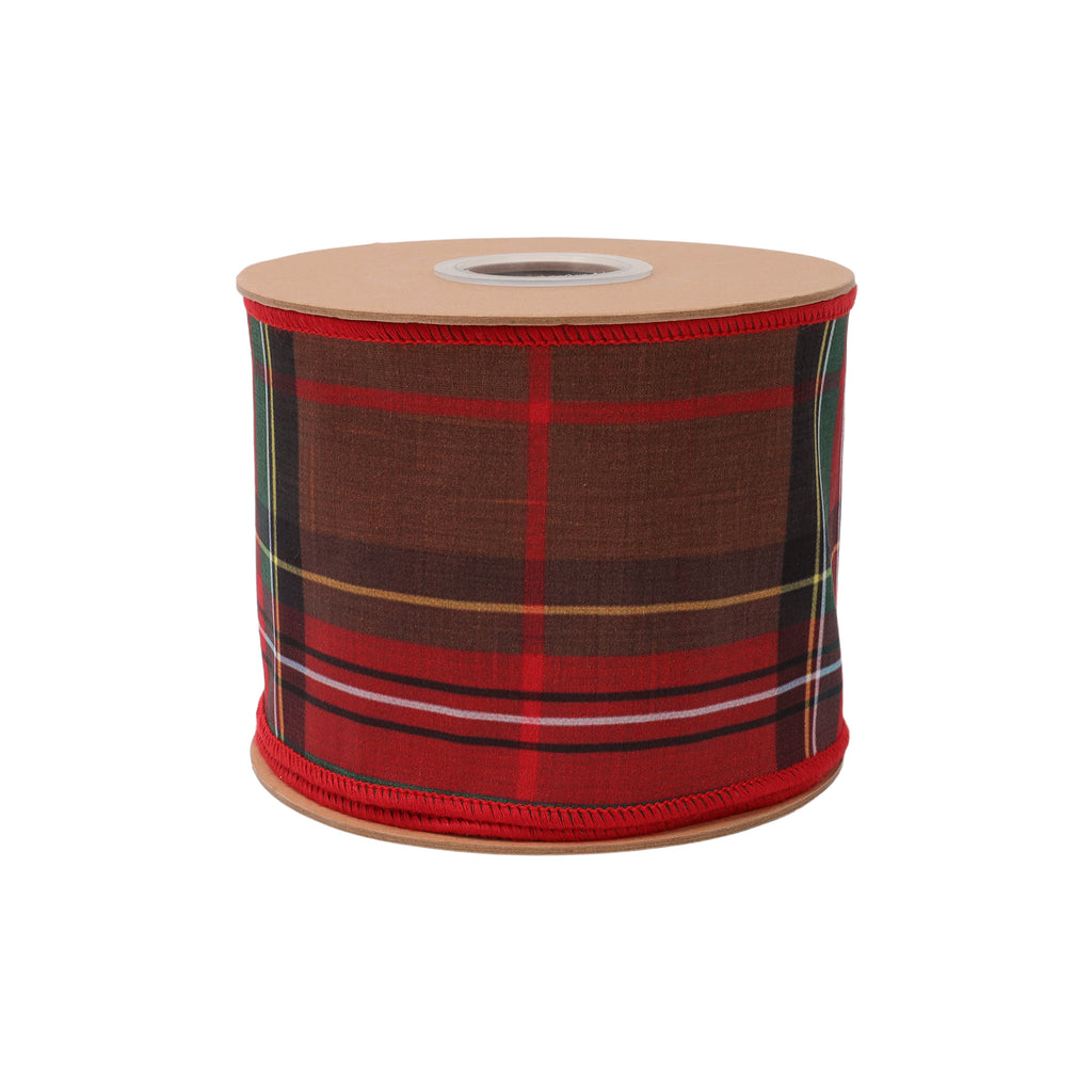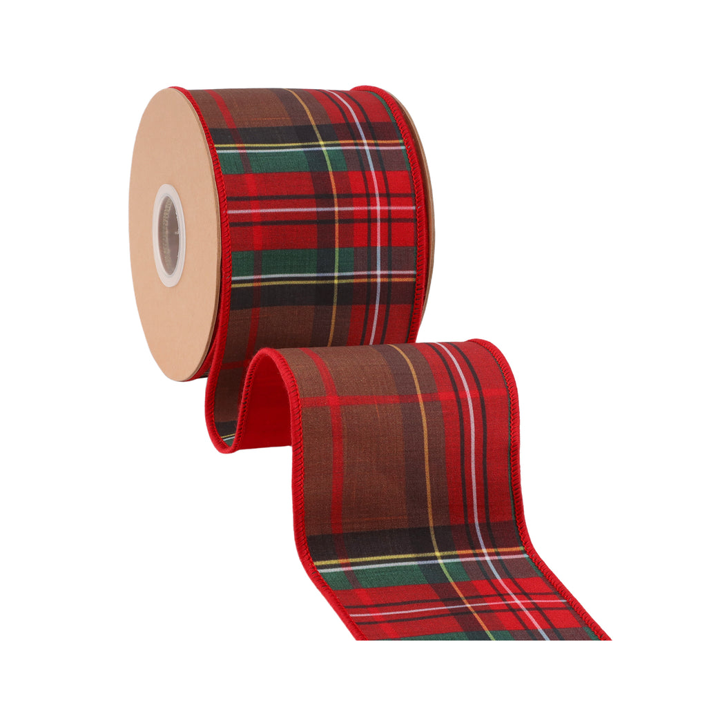 4" Wired Dupioni Ribbon | Red/Brown Plaid w/ Red Fused Backing | 10 Yard Roll