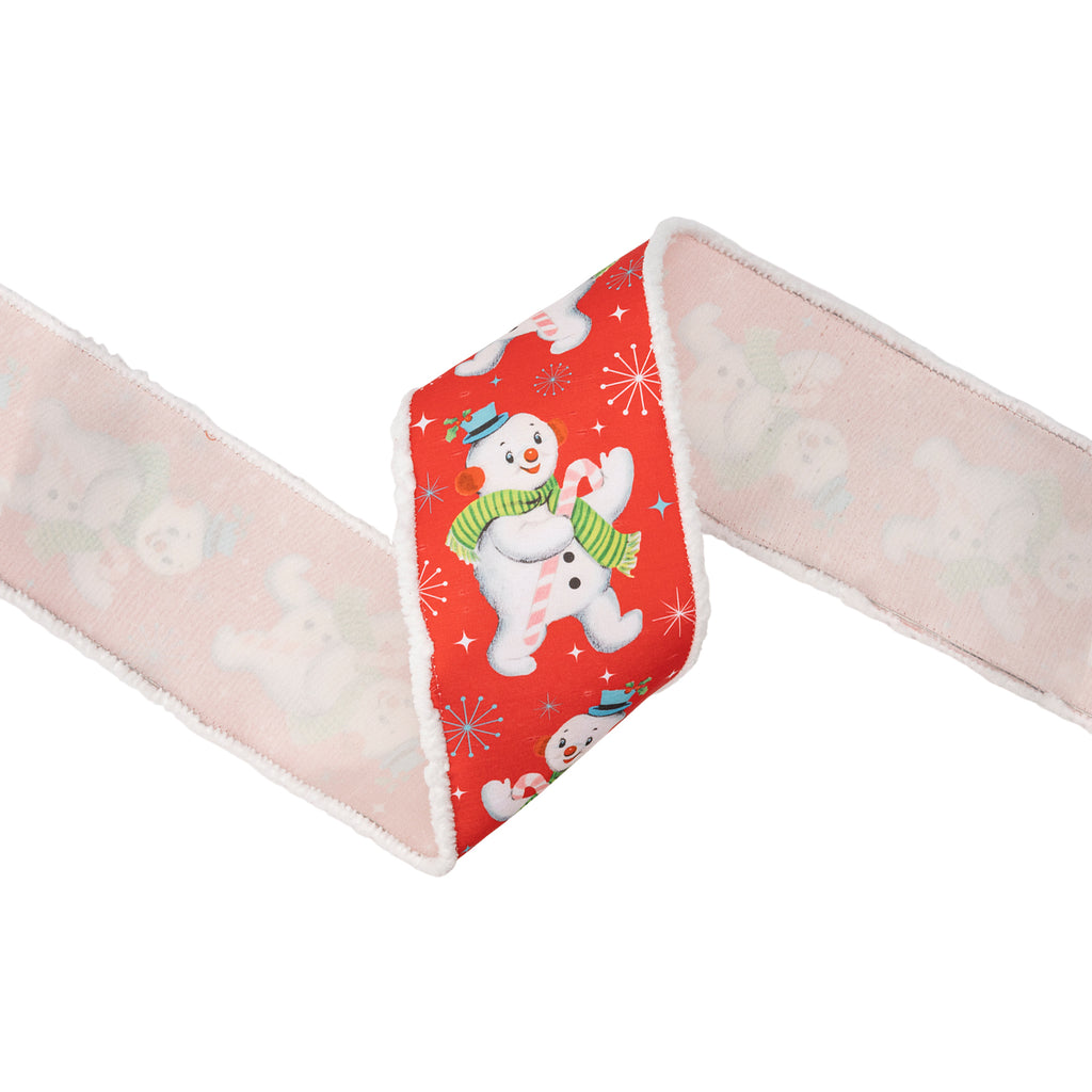 4" Wired Dupioni Ribbon | Retro Snowman on Red w/ Pom Pom Edge w/ White Backing | 10 Yard Roll