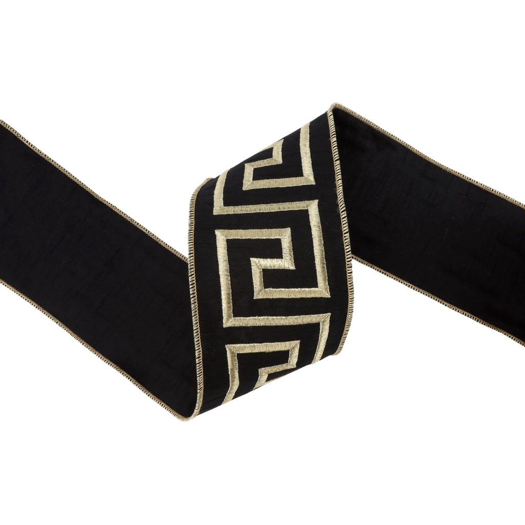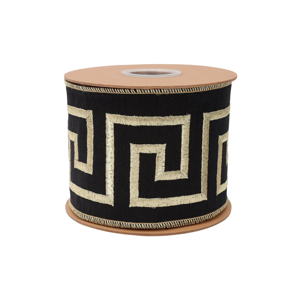 4" Wired Ribbon | Black/Gold Greek Key | 5 Yard Roll